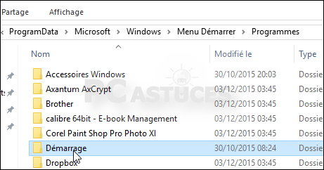 - Ouvrez une fenêtre d'Explorateur puis ouvrez les dossiers Ce PC, Disque local (C:), ProgramData, Microsoft, Windows, Menu Démarrer, Programmes puis Démarrage.