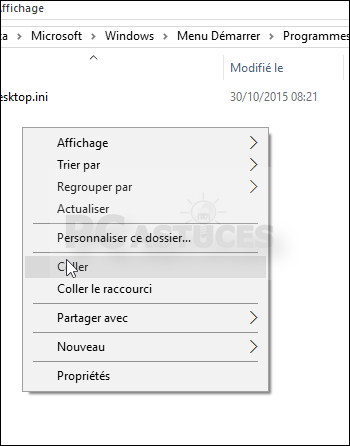 - Cliquez avec le bouton droite sur un espace vide de la fenêtre et cliquez sur Coller. Vous pouvez aussi créer directement un nouveau raccourci vers un logiciel en choisissant la commande Nouveau puis sur Raccourci.